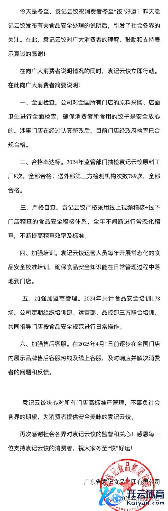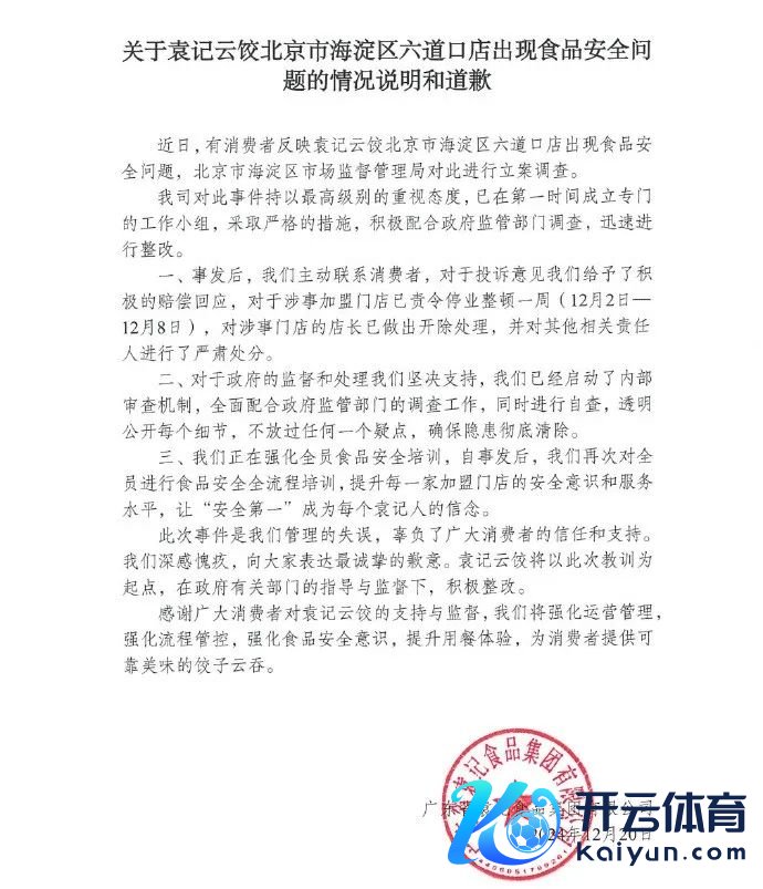 20日晚,袁记云饺发布《对于袁记云饺北京市海淀区六说念口店出现食物安全问题的情况发挥和说念歉》,其称,对涉事加盟门店已责令收歇整顿一周(12月2日—12月8日),对涉事门店的店长已作念出开除处理。