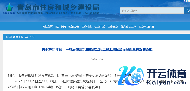近日,青岛市住房和城乡开采局发布了对于2024年第十一轮房屋建筑和市政公用工程工地扬尘治理张望情况的通报。现将主要情况通报如下: