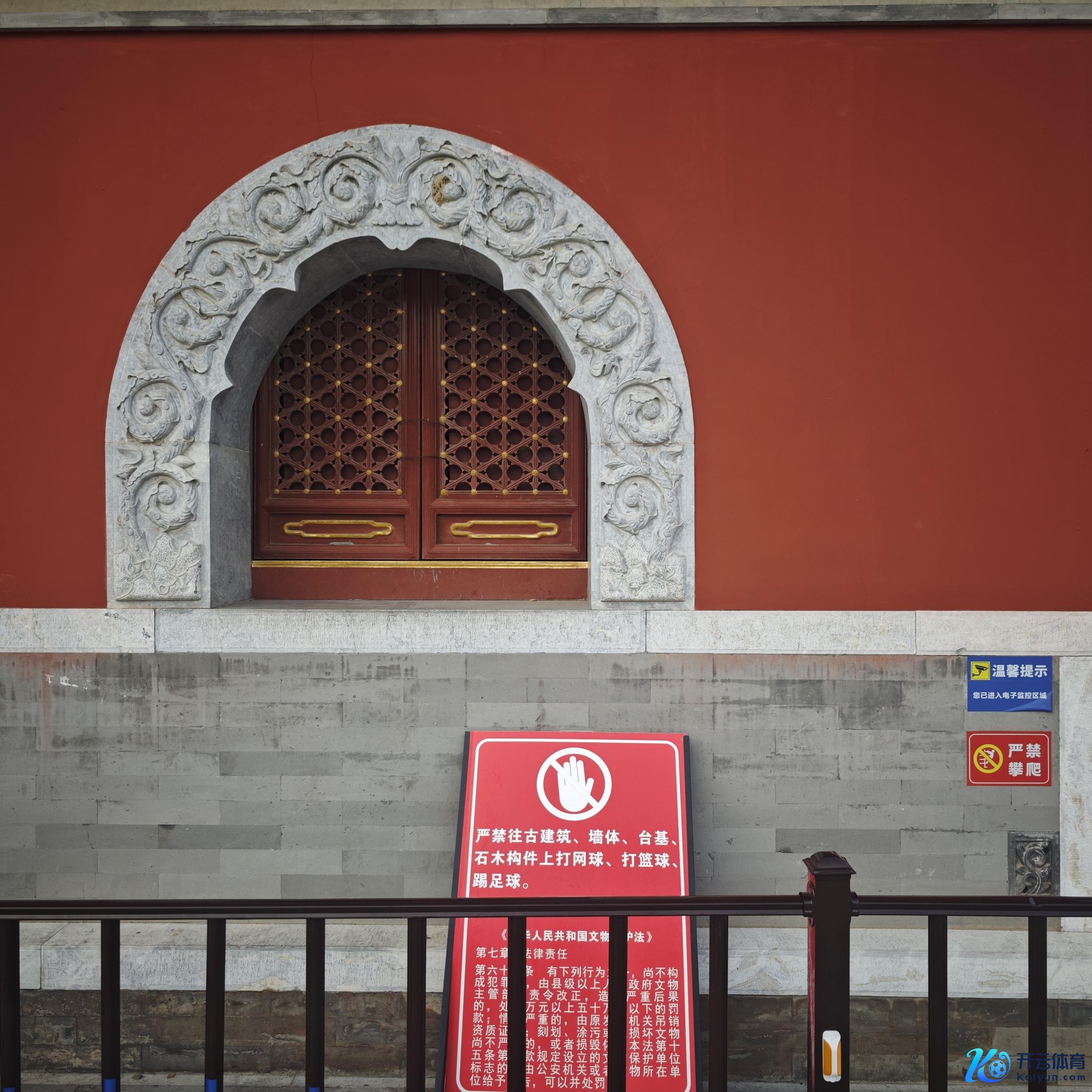 在辘集德寿古刹门红墙、东西两侧牌楼的周围还加装了几说念雕栏,掌握张贴着“严禁攀爬”“难得文物及保护要领”“您已进入电子监控区域”等警示口号。在几块醒筹划红色象征牌上,写着“严禁往古建筑、墙体、台基、石木构件上打网球、打篮球、踢足球”,况兼附上了文物保护法中对刻划、涂污概况损坏文物所喜悦担法律拖累的具体限定要求,从而起到警示震慑作用。