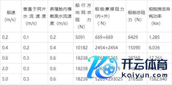 本例中铁心垂直流经金属网衣的海水最大流速为0.3m/s,在不同航速下金属网衣沿着船体出动目的所受到的海水阻力和繁衍工船在不同航速其船舶表里部所受摩擦阻力贪图末端如下(见表三)