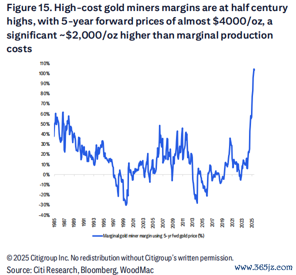 (高本钱金矿商的利润率处于半个世纪以来的高点,5年远期价钱接近每盎司4000好意思元,比边缘分娩本钱越过约2000好意思元)