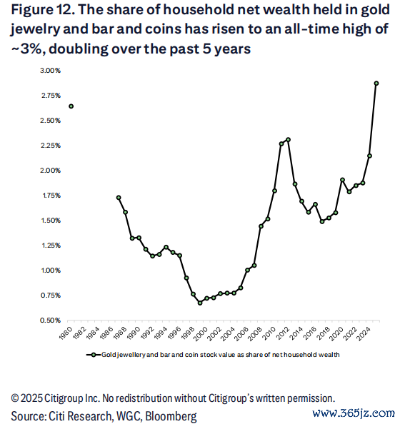 价钱已计入过多预期: 黄金价钱在畴前2-3年内果真翻倍,一经消化了大齐利好。黄金在家庭净钞票中的占比已升至近3%的历史高位。