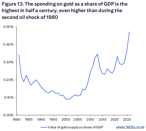 商场可能已过程度拥堵:世界黄金开销占GDP的比重也达到0.5%,为近半个世纪以来的最高水平。